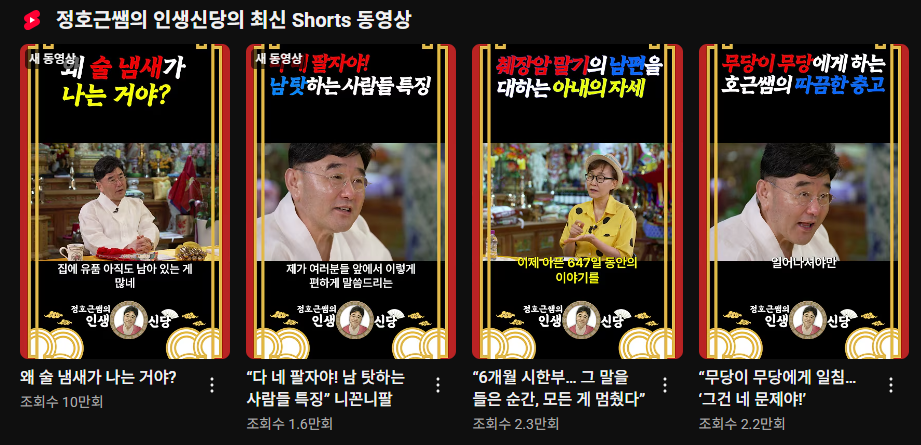 또한, 유튜브 채널 '정호근쌤의 인생신당'을 통해 온라인에서도 대중과 소통하고 있죠. 이전에는 '정호근쌤의 인생상담'이라는 이름으로 활동하다가 2023년 9월 채널명을 변경했습니다.